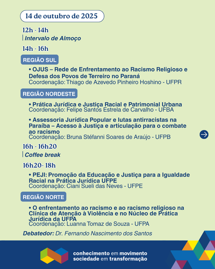 Nos dias 13, 14 e 15 de outubro/2025, no Instituto de Ciências Sociais da Universidade de Brasília (UnB), as coordenações regionais dos projetos selecionados de todo o Brasil estarão presentes em Brasília apresentando os resultados das pesquisas realizadas durante os 12 meses de vigência das bolsas.